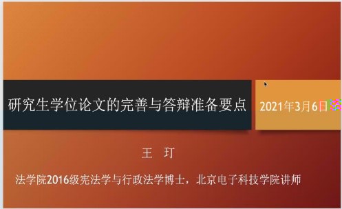 優秀畢業生代表、校級優秀博士論文獲得者王玎以本人博士論文為例,分享了論文修改和答辯經驗。他從内容完善、格式完善、查重、答辯四個方面給畢業生提出了建議,尤其要注重标題的表述和語言的準确、簡潔。針對格式問題,他強調要查閱學校關于論文形式要求的文件。最後,王玎講授了答辯的準備與技巧。